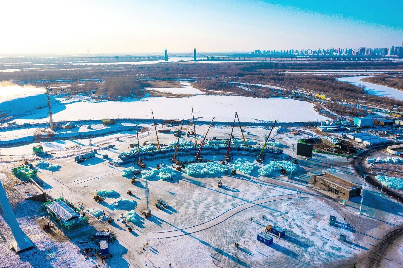 哈尔滨冰雪大世界“梦念念大舞台”树立中。图片由哈尔滨冰雪大世界提供
