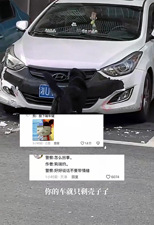 通过图片和监控不错看到车子一直被一条大黑狗撕咬,保障杠被咬的稀烂;道理的是双方的车并莫得被咬……马女士在现场足足笑了十多分钟。