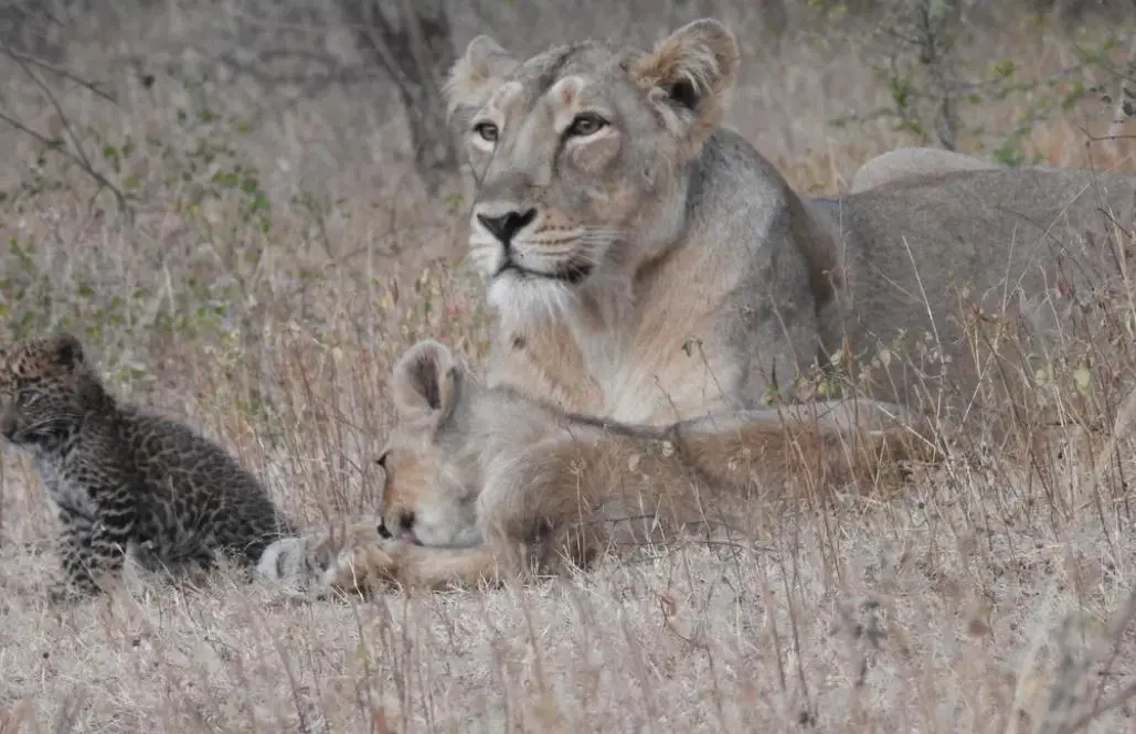 2018年印度2018年12月,印度吉尔国度公园的辩论东谈主员在执续45天的监视后证据:这只母狮是的确收养一头2个月大的豹子幼崽!吃奶什么的都不特殊了,以致这只豹子还跟母狮的2只幼崽玩呢!